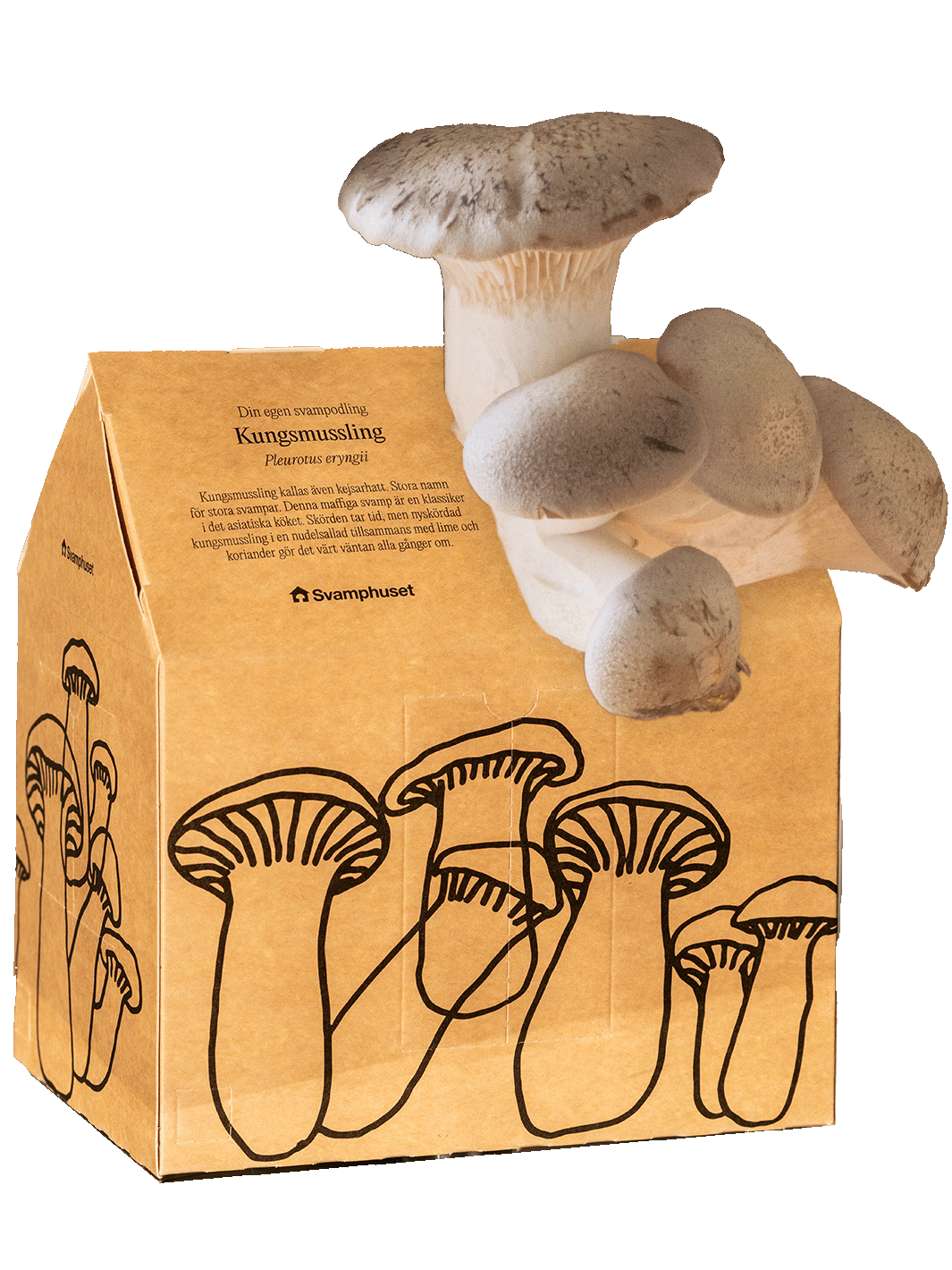 Das Svamphuset mit Kräuterseitling (Pleurotus eryngii) ist ein komplettes Anzuchtset, das den Anbau zu Hause ganz einfach macht. Wählen Sie zwischen zwei Designs – klassisches Haus oder schlichte Kartonverpackung – beide sind gleichermaßen leicht zu verwenden.