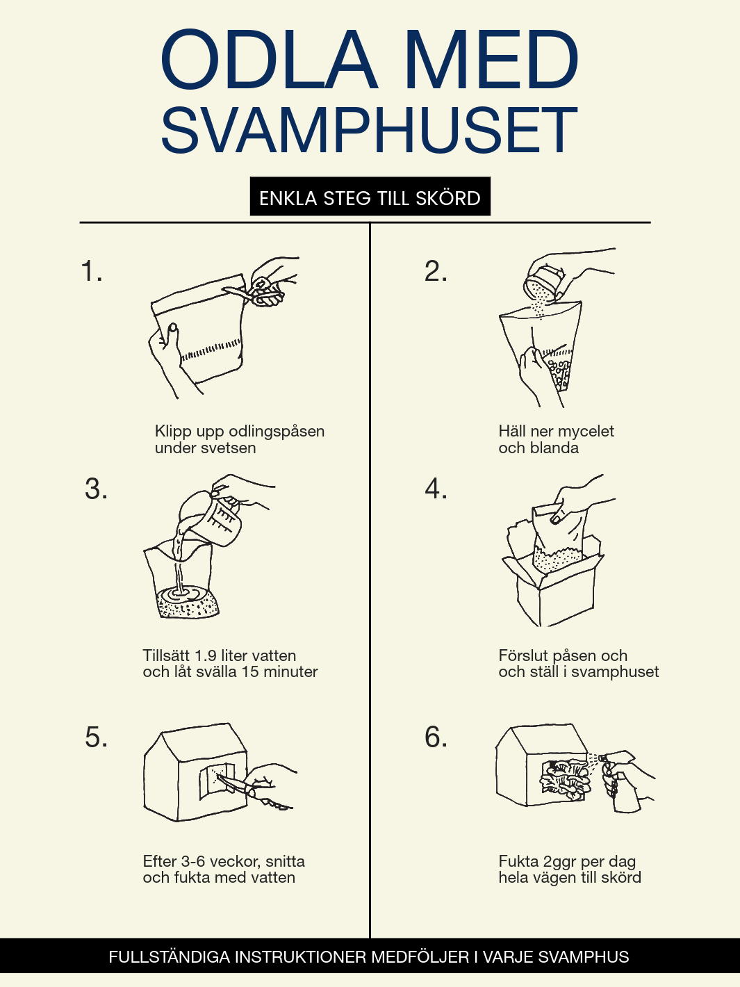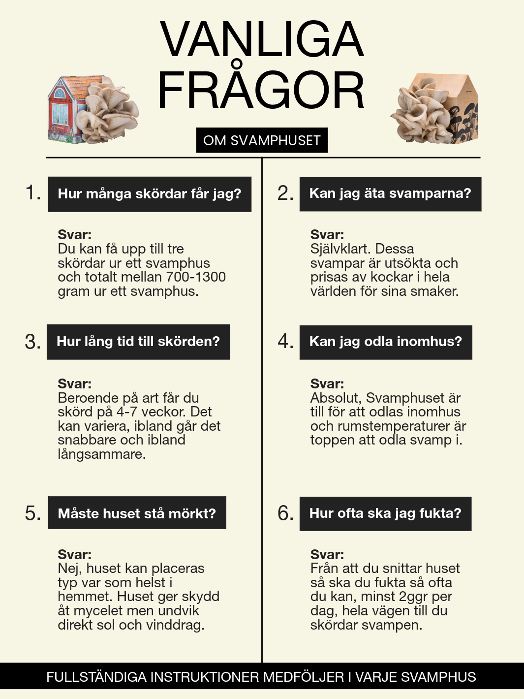 Vi garanterar en skörd enligt våran skördegaranti. Men! vanligen brukar man få tre skördar per svamphus om man följer våra instruktioner nogsamt och har lite tålamod. Skörderekordet ligger just nu på sju, men det är väldigt ovanligt. Oavsett antal skördar är varje skörd lika rolig att följa – från små "svampknoppar" till fullstora svampar på bara några dagar efter att du gjort ett snitt i odlingspåsen innanför huset.