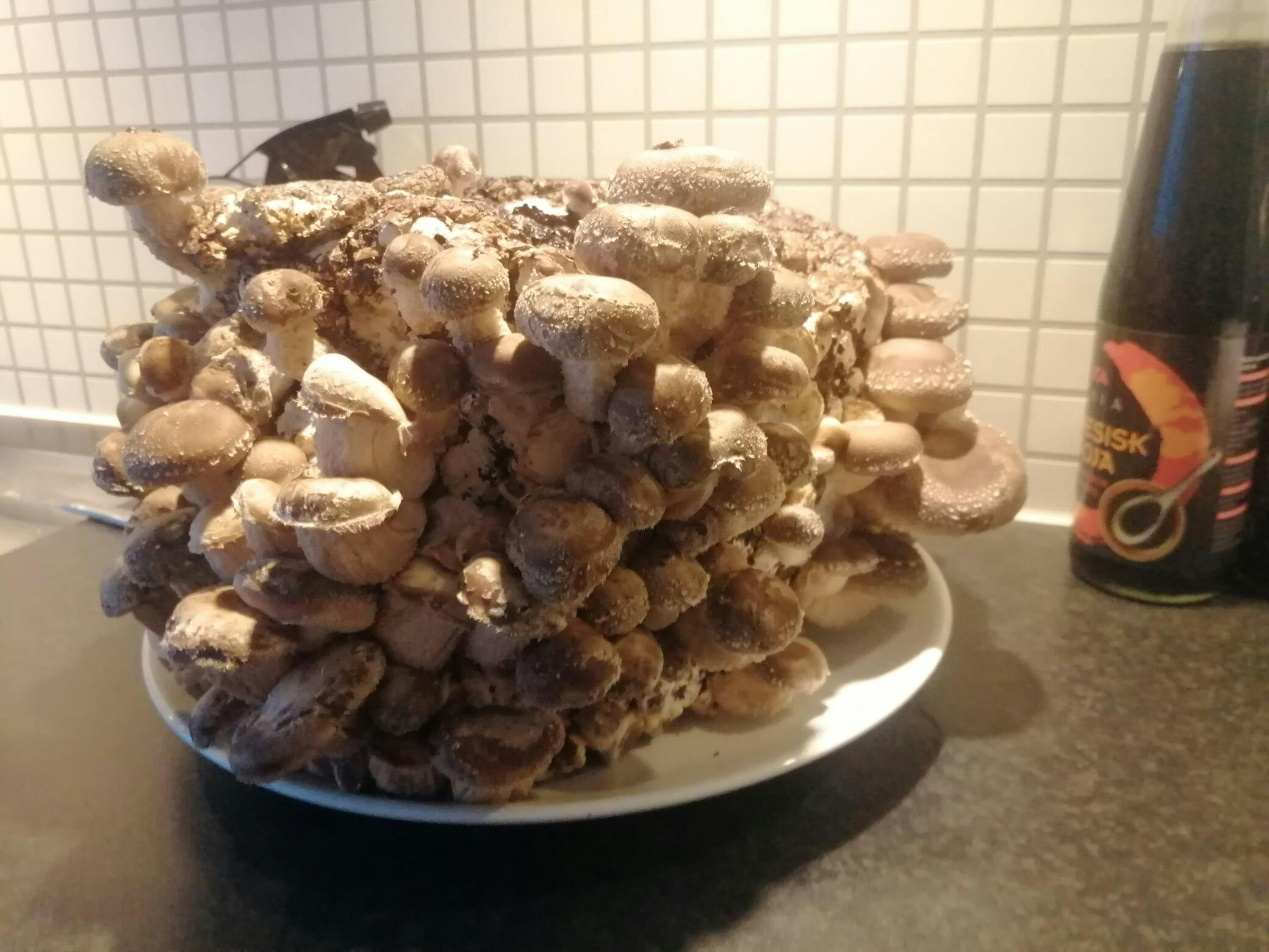 Odlingsblocket levereras färdigt för fruktsättning och inte sällan med små fruktkroppar som redan bildats. Ta av plasten helt och spraya blocket flera gånger om dagen och se svampen växa. Vi rekommenderar starkt att du bygger en fruktkammare för just shiitake. Det är enkelt, billigt och du kan använda fruktkammaren i flera år. Här har vi en guide som beskriver hur du gör.
